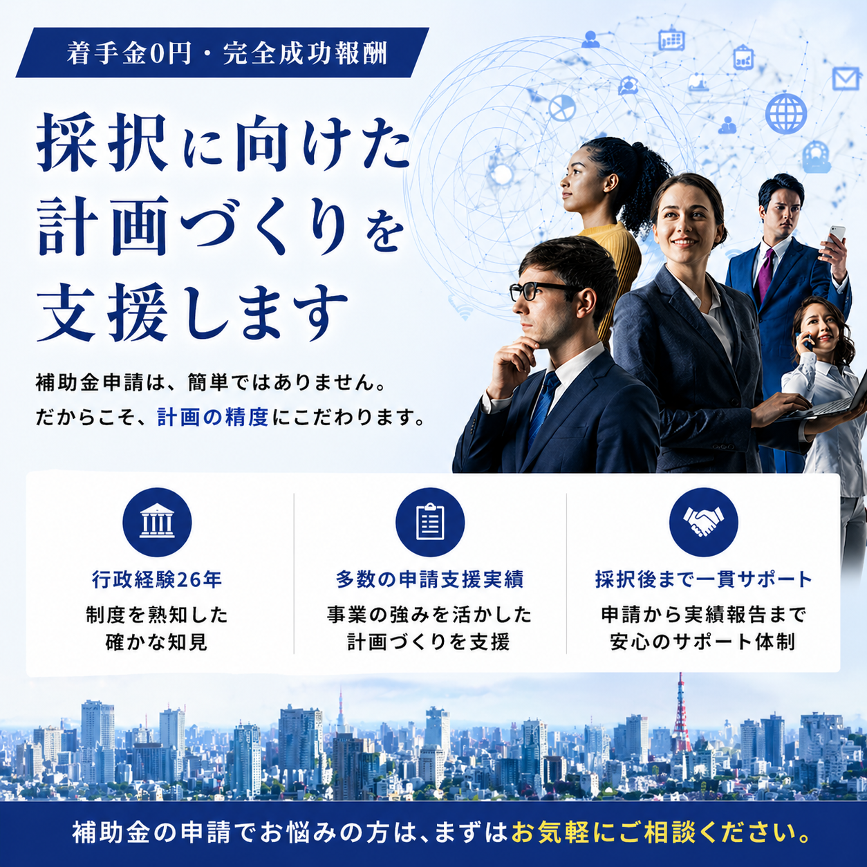 中小企業省力化投資補助金(一般型)第6回 募集中 💡 人手不足・業務効率化でお悩みの事業者さまへ 【中小企業省力化投資補助金(一般型)】第6回申請に対応しています。 DX・自動化・省力化に向けた設備投資について、 採択を見据えた事業計画の整理から申請まで、一貫してサポートいたします。 📌 当事務所の申請支援の特徴 ・公募要領・審査観点を踏まえた、実現性重視の事業計画作成 ・「とりあえず申請」ではなく、採択可能性を最優先した支援 ・導入設備や事業内容の整理段階から丁寧に伴走 📊 このような事業者さまにおすすめです ・人手不足を解消したい ・業務の属人化や非効率を改善したい ・DXや設備投資を検討しているが、整理できていない 📝 当事務所対応枠:残り1枠(先着順) 現在ご相談が集中しております。 対応枠に限りがあるため、ご検討中の方はお早めにご連絡ください。 👉 まずは「申請できるかどうか」のご相談からでも構いません。 ※初回相談では、申請可否や進め方について整理いたします。 ※無理な営業や即決のご案内はいたしませんので、ご安心ください。 |
