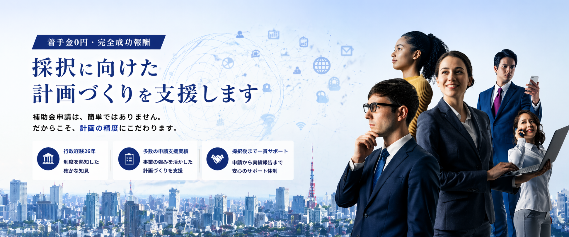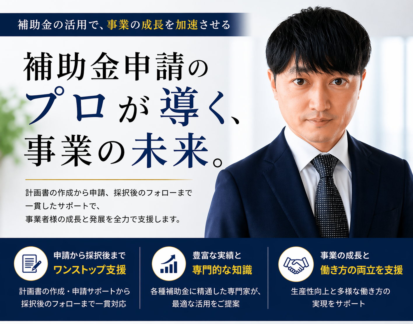 申請に必要な計画書の作成・確認から、採択後のフォローアップまで、トータルコンサルティングを提供し、企業の成長を力強くサポートいたします。